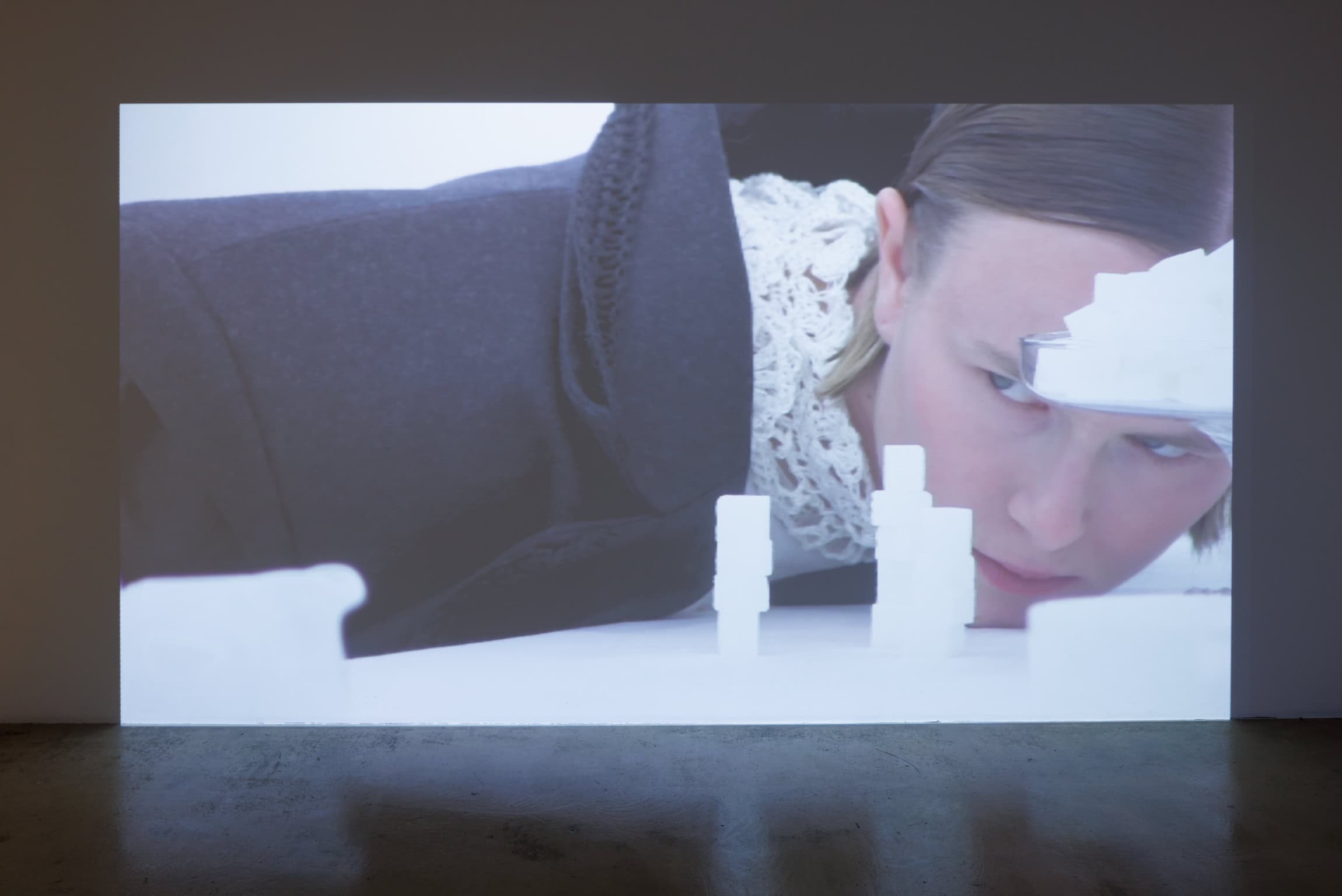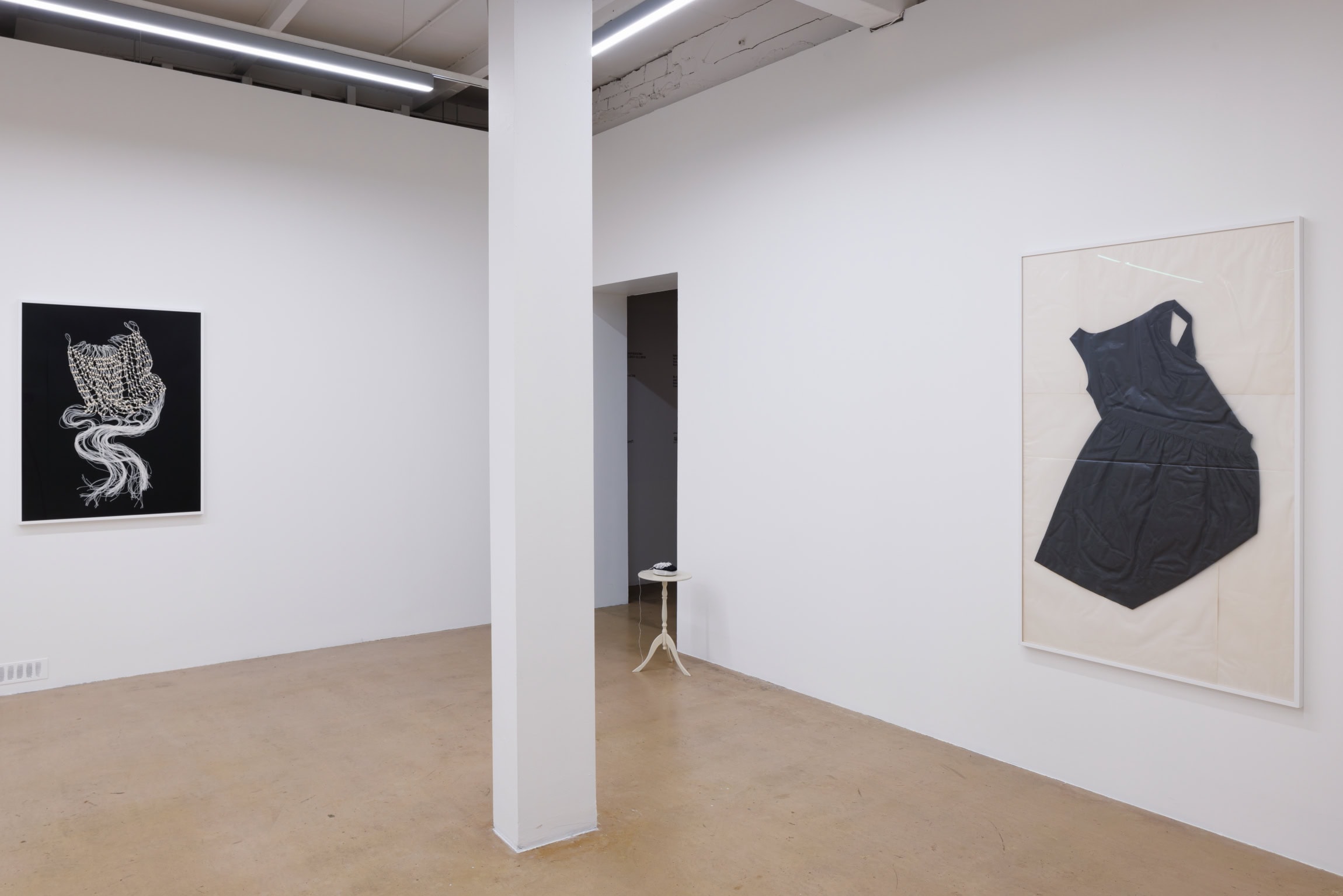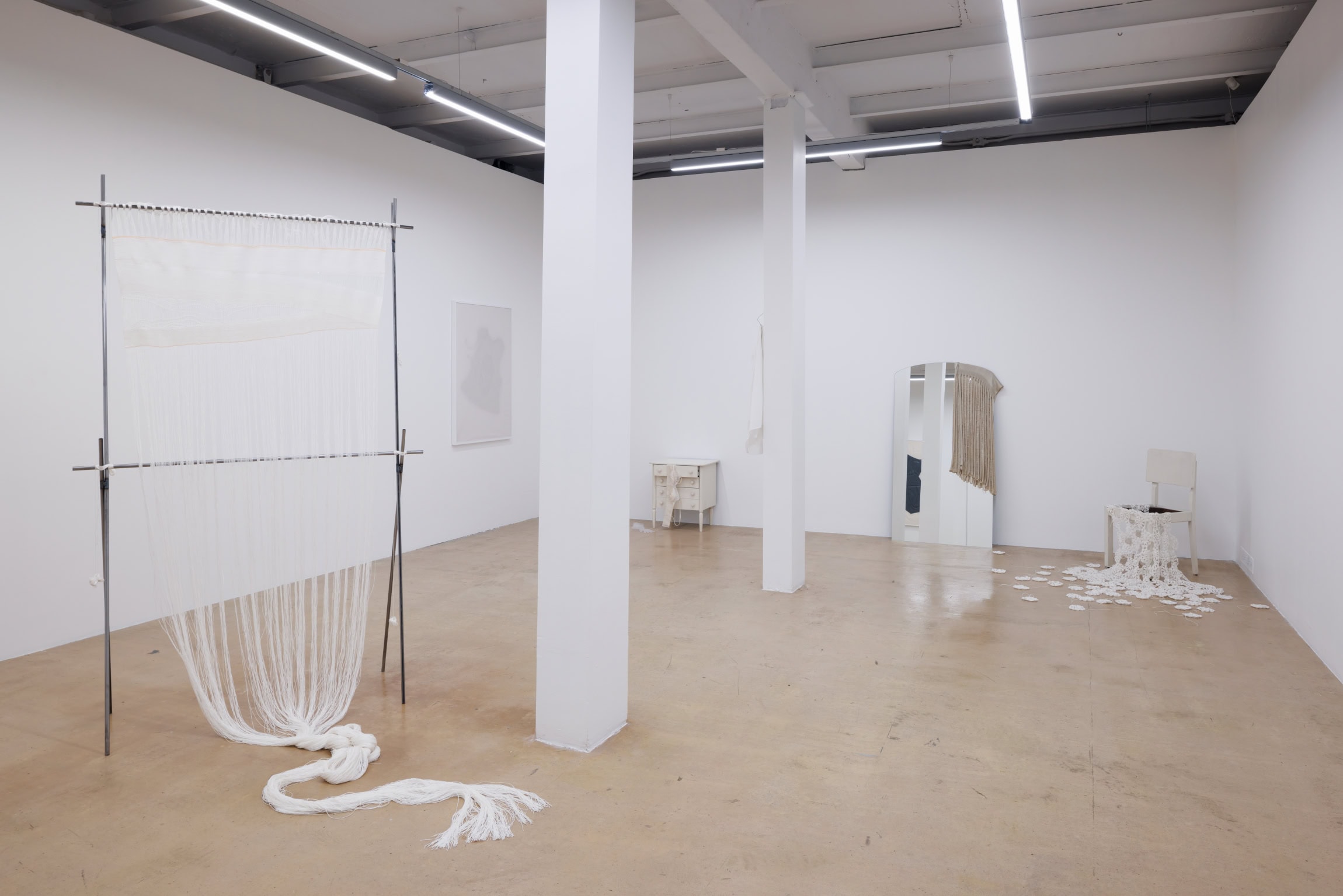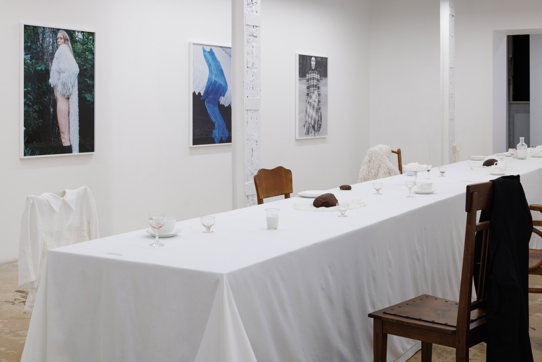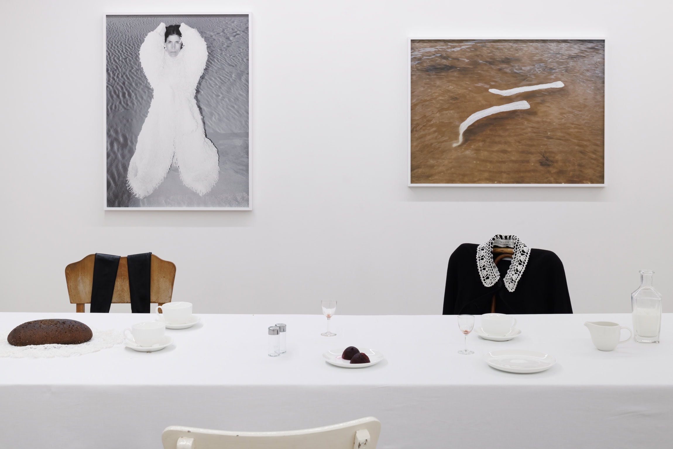 In Traces, threads of inspirations and community rituals that have settled into personal and collective memory weave together, associatively suggested by the concluding part of the exhibition: an improvised meeting place made up of chairs and a long table. This installation, created in collaboration with artist and set designer Haleimah Darwish, serves not only as a “stage” for craft techniques, but also a surface on which the imagination is laid out and the bustle released by mutual respect takes hold. Placed on the group of tables, unencumbered by decoration, these integral elements of SKARULE’s language – clusters of thread-cord-crochets – further serve as props for the kitchen-semiotics-tinged performance by the artist and model Britt Liberg. Substituting spoken language for role play, the artist takes on a dinner setting to embody and shift in between the characters of butler, lady and child-woman. Recorded behind closed doors on the eve of the opening, video documentation of the event awaits the viewer at the start of the exhibition.