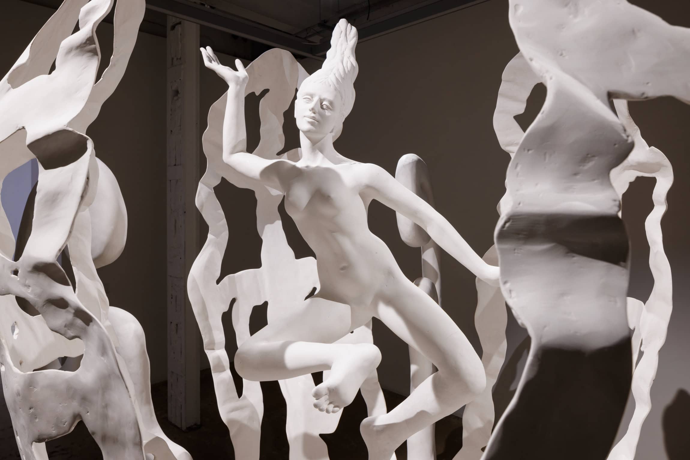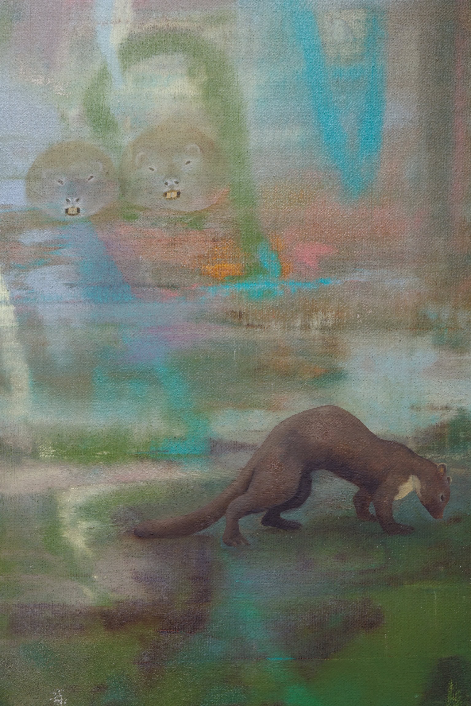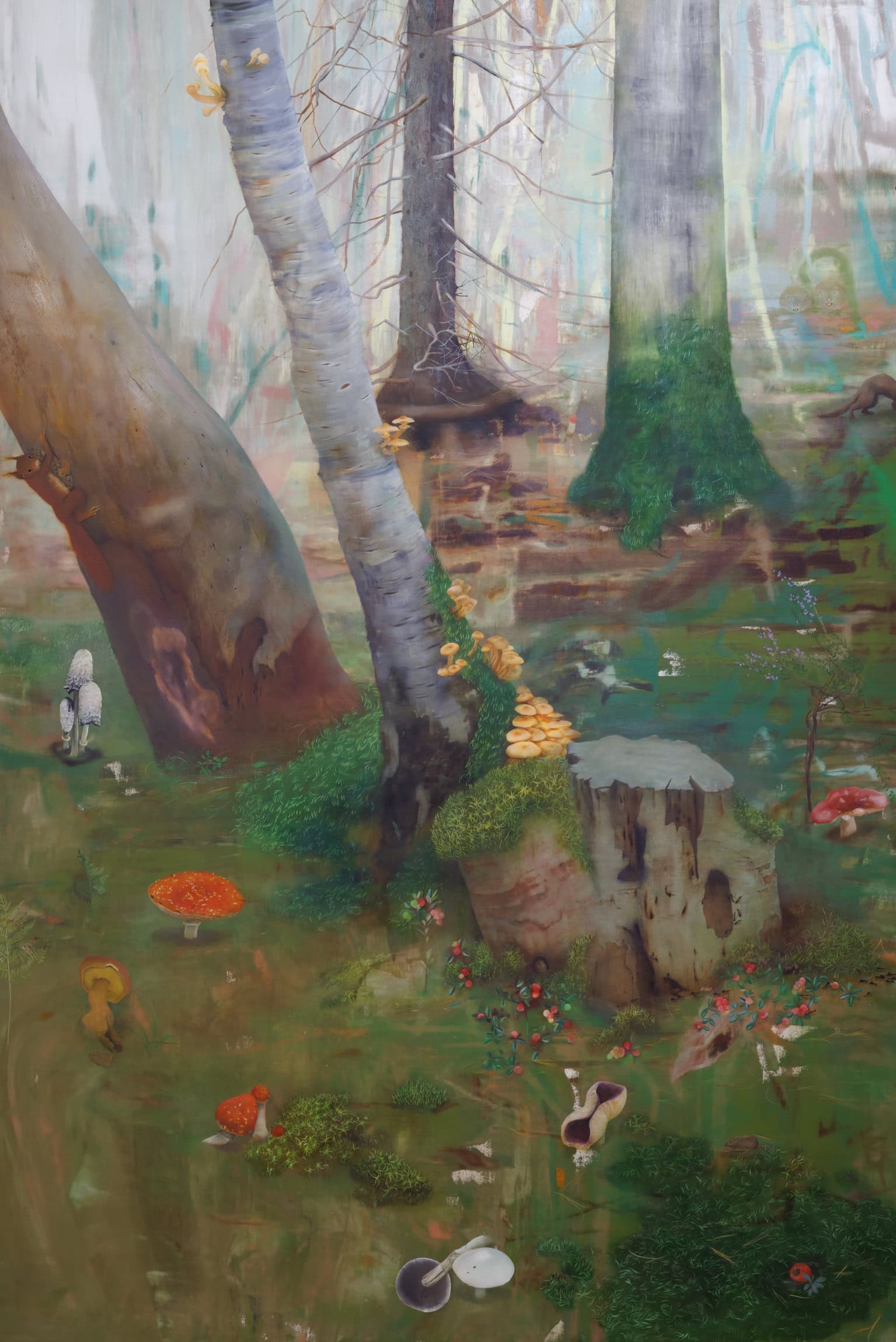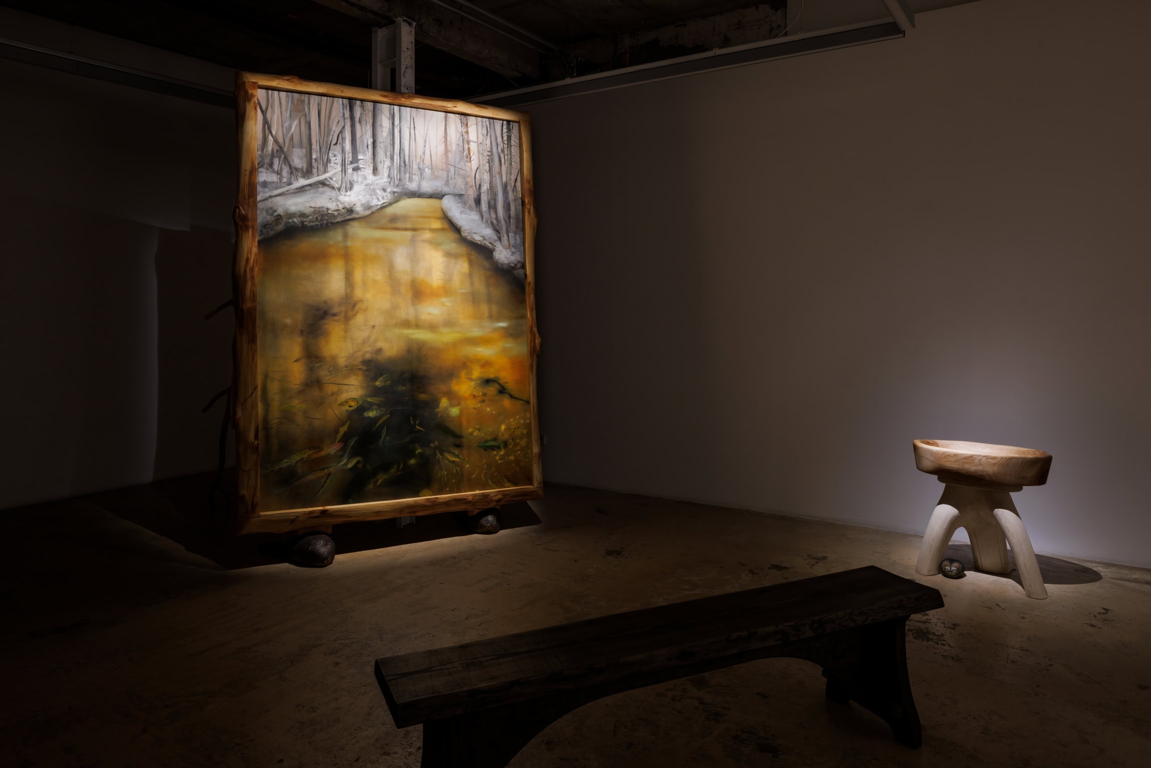 Noslēdzošā telpa darbojas kā procesa kondensācija – vieta augļiem, kur iepriekšējās enerģijas nosēžas klusā, piesātinātā līdzsvarā. Tā ir vide, kurā gaismas un tumsas spriegums uzbur meditatīvu noskaņu, bet meža un ūdens semantika aktualizē piederību zemei, saknēm un pirmavotam. Izstāde noslēdzas ar sievišķā spēka plaukumu – kā devīgumu, pieņemšanu un iekšējā miera sajūtu, atstājot skatītāju rezonējošā klusumā un personiskās pieredzes telpā.
